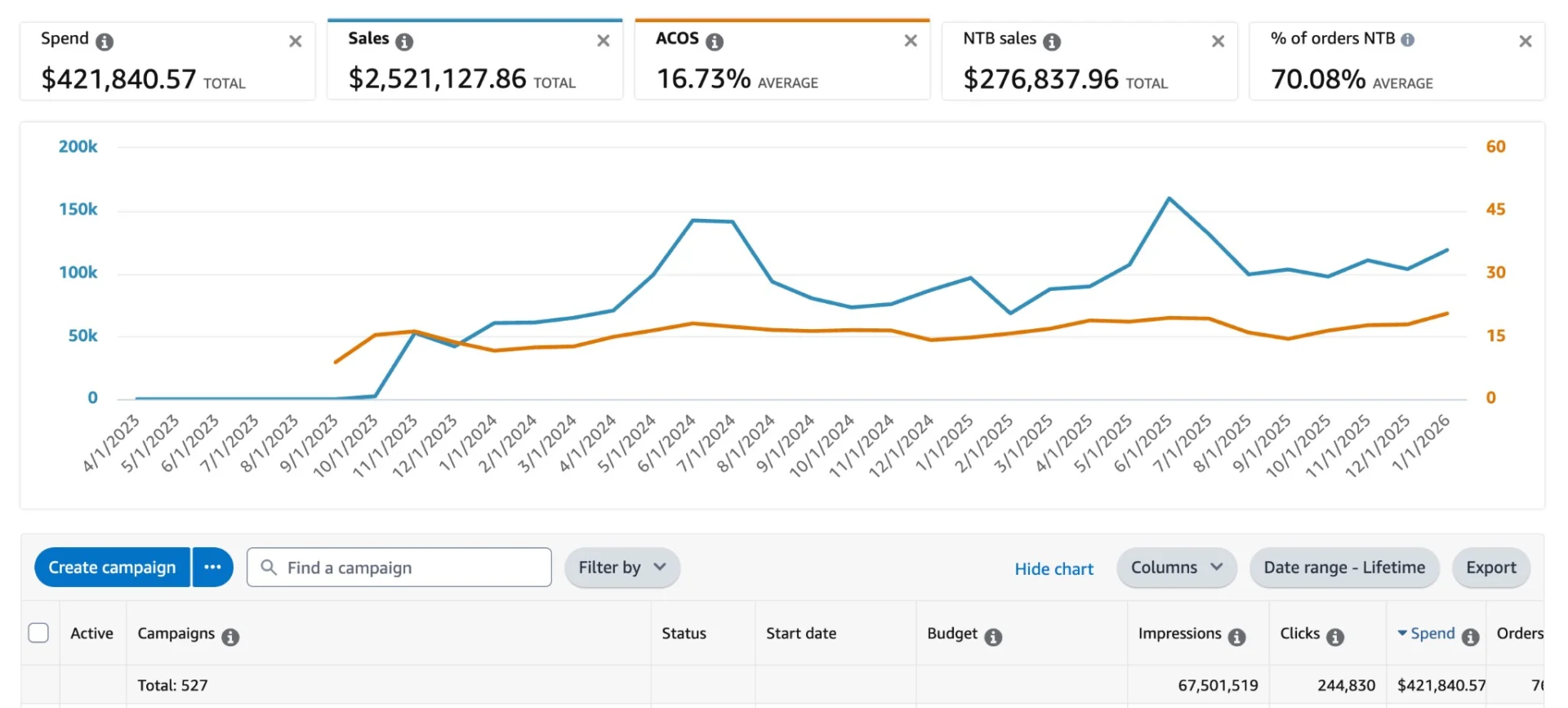 Amazon Ads were restructured for full coverage across discovery, consideration, and retention. The account generated 67.5M impressions, 244,830 clicks at $1.72 CPC, 76,425 orders, and maintained 16.73% ACOS and 5.98 ROAS, with 70.08% of ad-attributed orders coming from New-to-Brand customers.