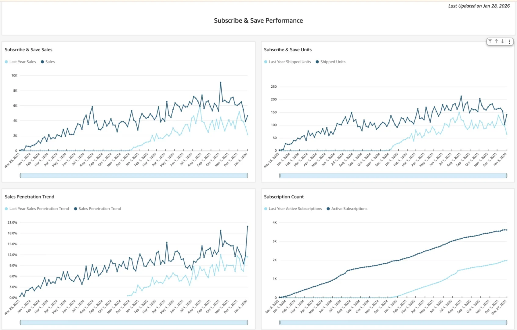 - Subscribe & Save sales and units grew consistently year over year, with peak daily sales increasing from roughly $3K–$4K last year to $6K–$9K during peak periods, and shipped units scaling from ~80–120 units/day to 150–200+ units/day at peak.