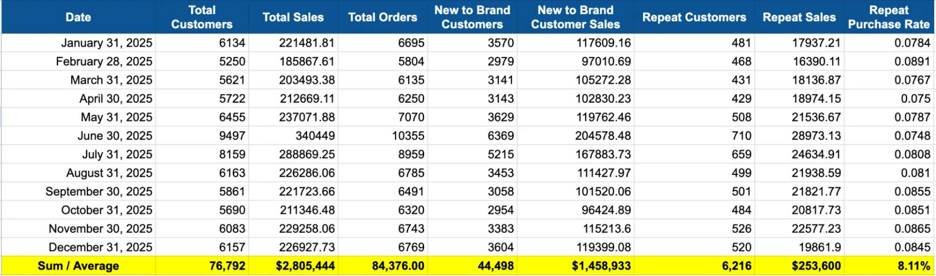 In 2025, the brand generated $2.8M in Amazon revenue, acquiring 44,498 New-to-Brand customers who contributed $1.46M (52%) of total sales. At the same time, the brand sustained an 8.11% repeat purchase rate across 6,216 returning customers, with an average 4–5 week reorder cycle (4.61 weeks).