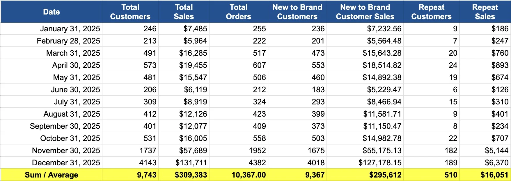 Growth was overwhelmingly driven by incremental demand. From September through December, 96%+ of customers were New-to-Brand, contributing ~96% of total revenue. New-to-Brand customer count increased from 373 in September to 4,018 in December, while New-to-Brand sales grew from $11.1K to $127.2K over the same period.