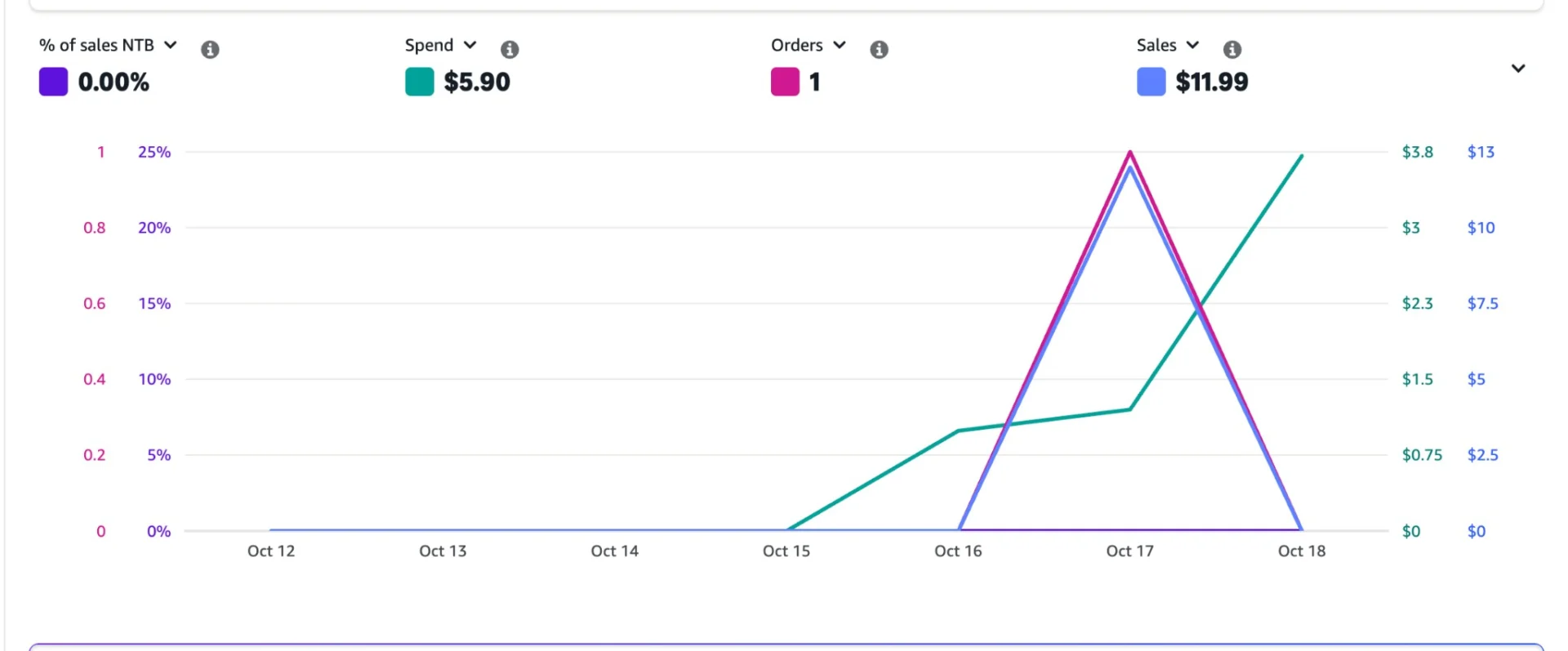 Most critically, Amazon PPC was not driving customer acquisition. During the baseline period, the account generated only one ad-attributed order, and New-to-Brand sales were 0%, indicating the brand was not reaching new Amazon shoppers through advertising.
