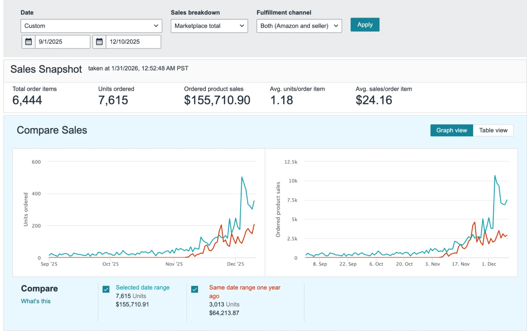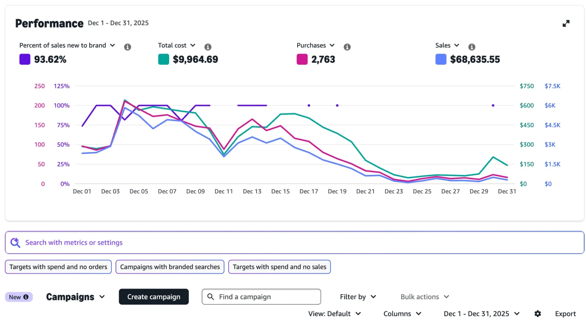 Within 90 days of onboarding (September–December 2025), the brand transitioned from low-volume, inconsistent performance to a rapidly scaling Amazon sales channel driven by New-to-Brand acquisition and improved conversion efficiency.
