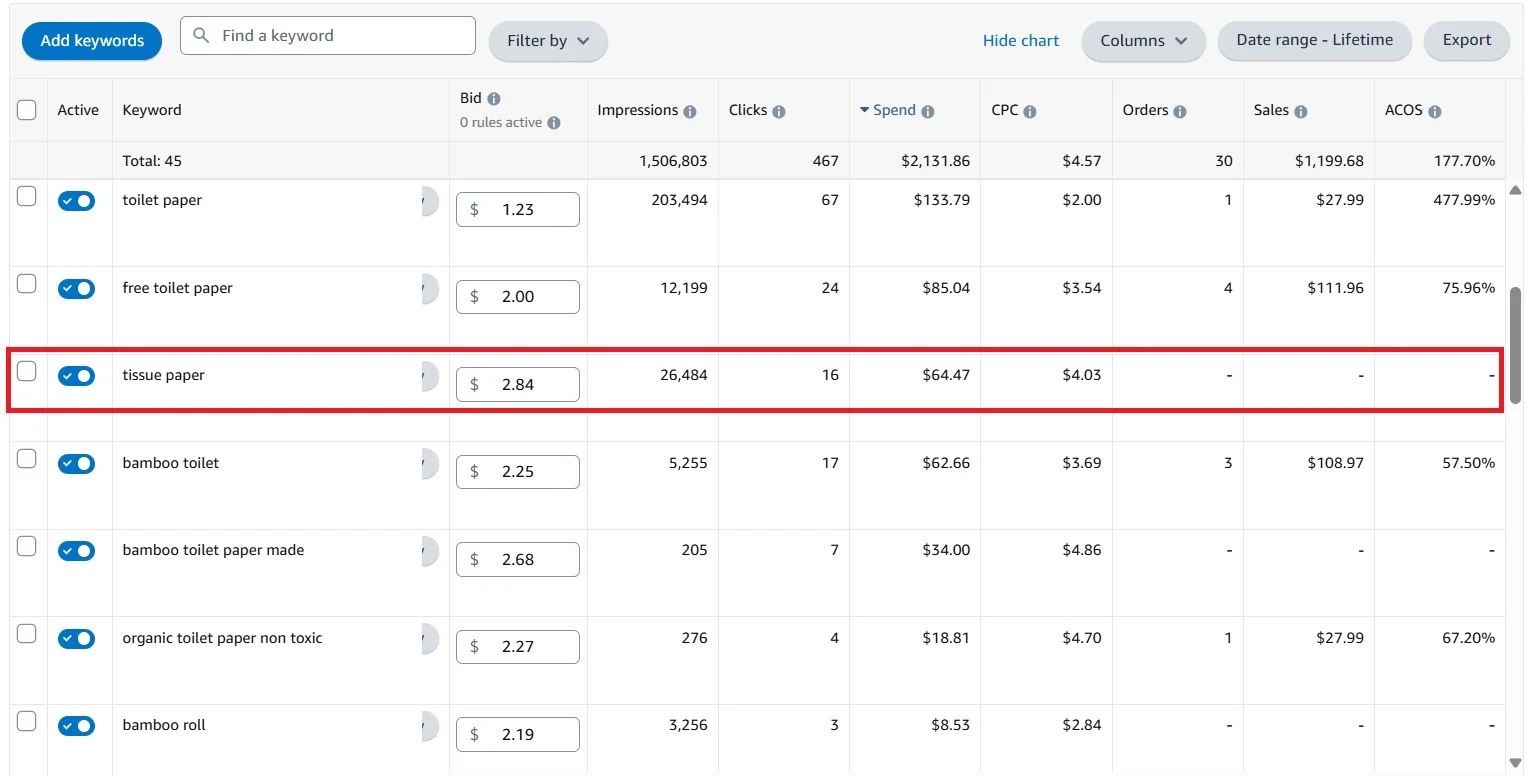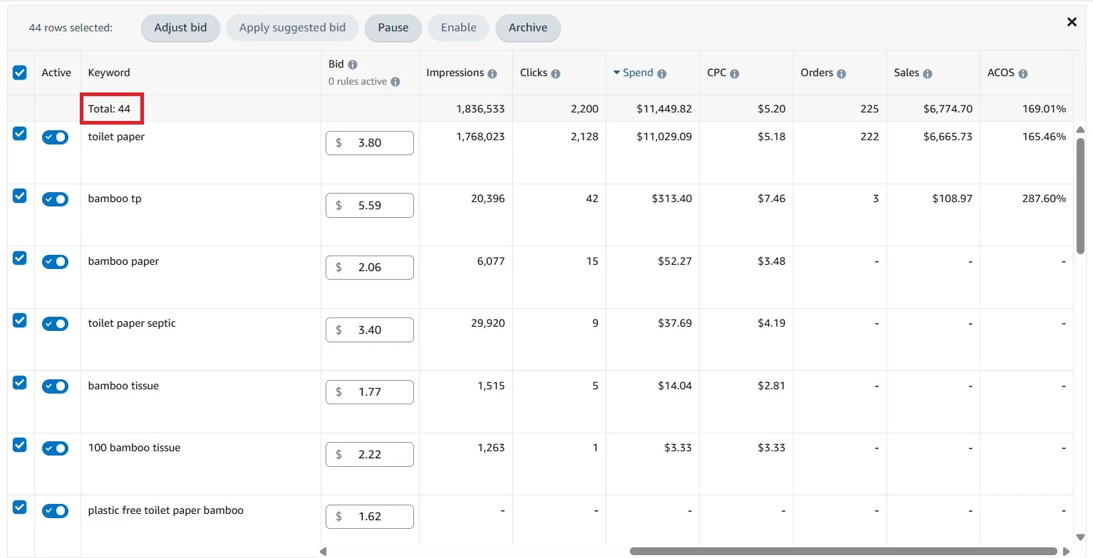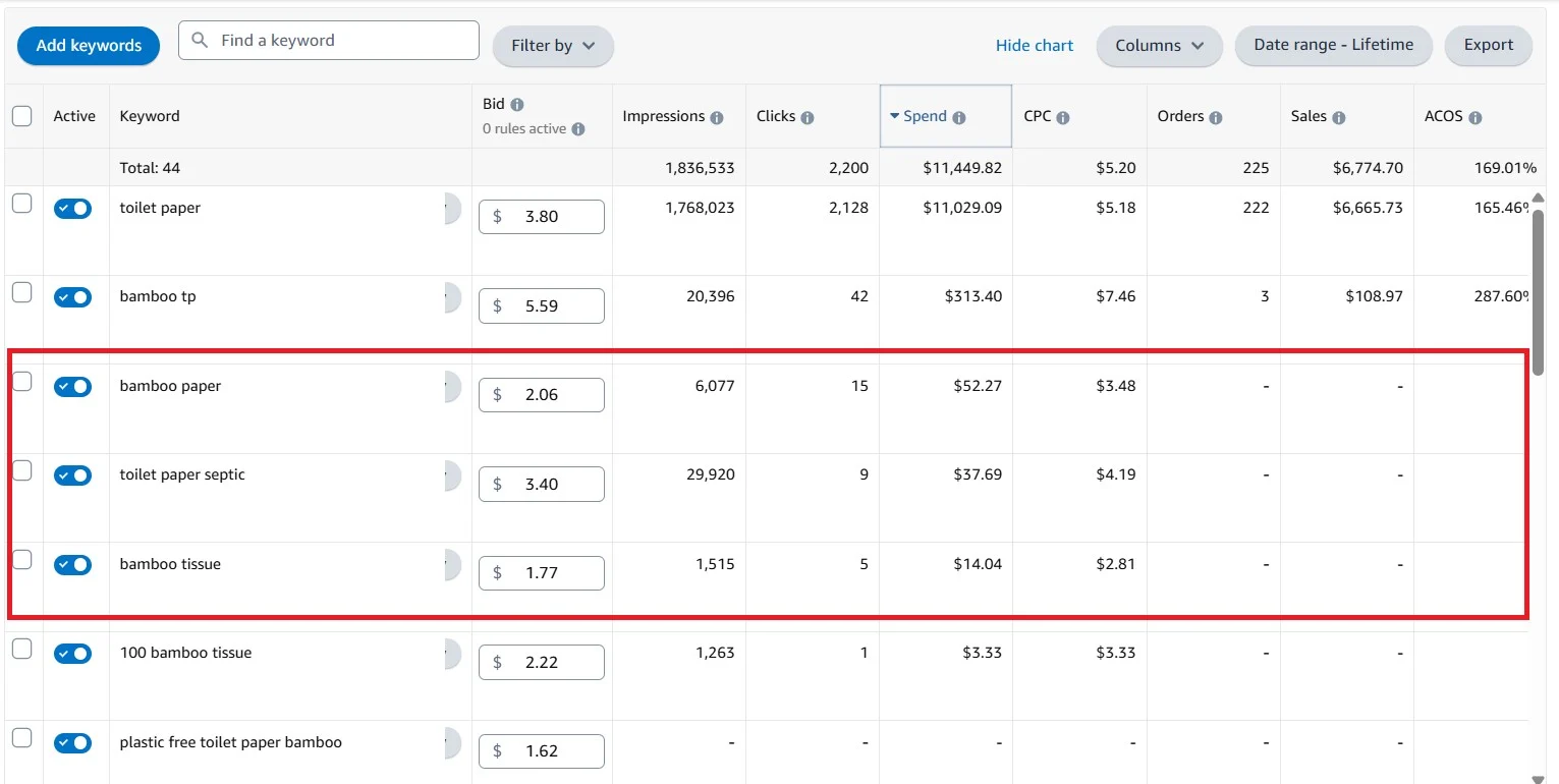 Second, we cut non-performing targets. Keywords and product targets that were spending without producing sales were paused or bid down. This immediately stopped budget from leaking into low-quality traffic and freed spend for proven searches.