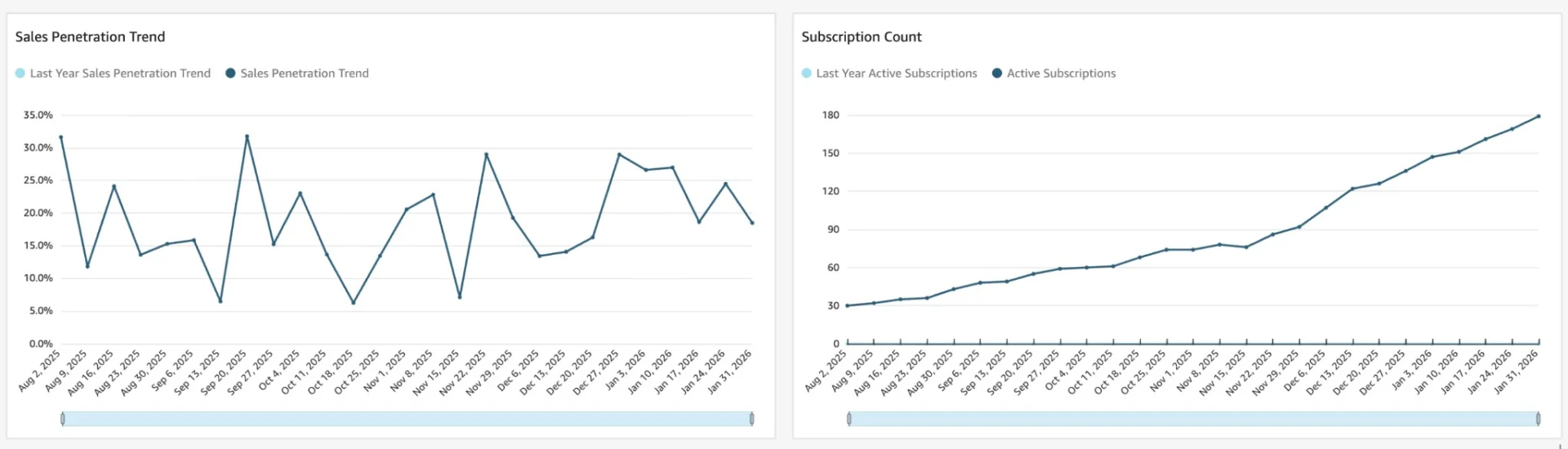 - Active subscriptions steadily grew from ~30 to ~180, showing consistent adoption over time