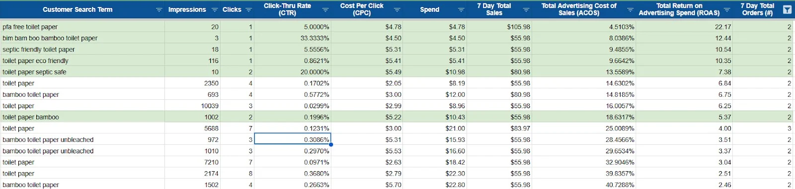 First, we removed irrelevant keyword targeting. Broad category searches that did not clearly match a bamboo, non-toxic, or eco-friendly intent were paused. Budget was redirected toward long-tail, product-specific searches that reflected why customers actually choose bamboo products, such as plastic-free, unbleached, and septic-safe.