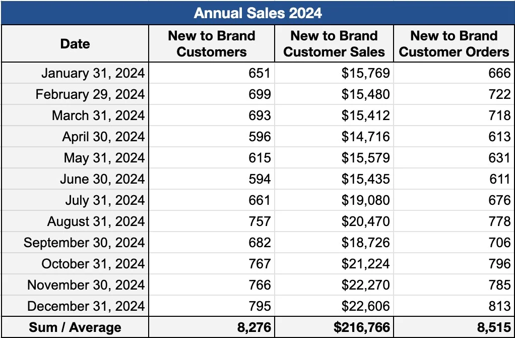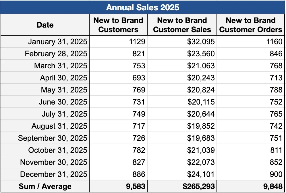 In 2025, the brand acquired 9,583 New-to-Brand customers, generating $265,293 in New-to-Brand sales across 9,848 first-time orders.