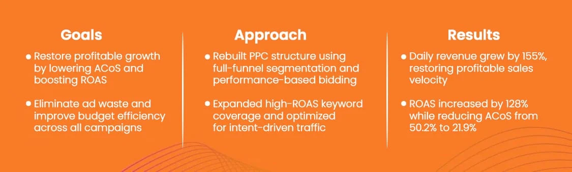 The brand lacked campaign-level data clarity, limiting their ability to track high-ROAS assets and eliminate unprofitable keywords.